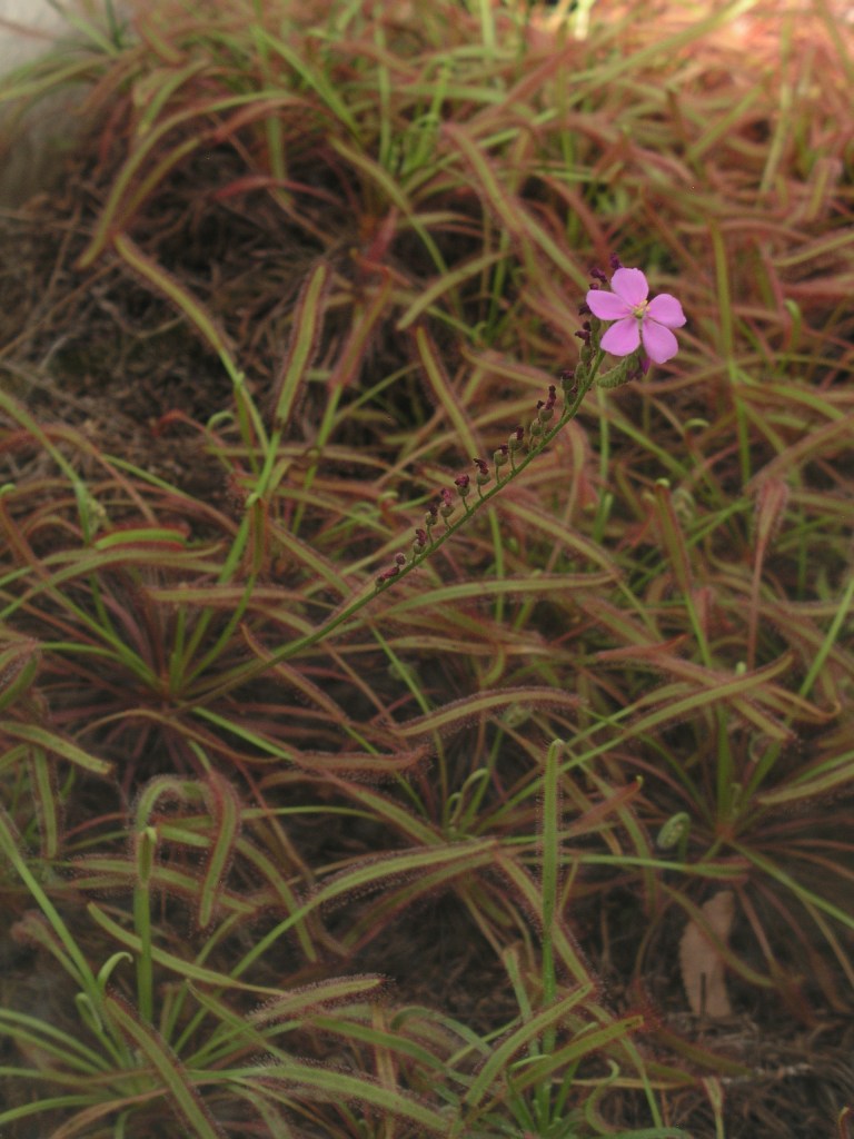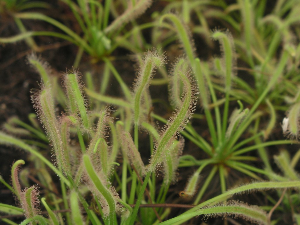 Sundews like these have long slender leaves with little hairs on them. Each hair has a glob of sweet, sticky sap to attract and trap insects. Once trapped, the leaf slowly curls around the insect to digest it.